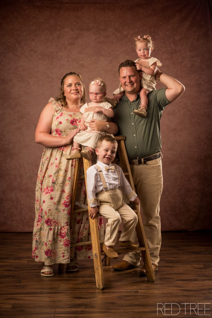 The Egerts wanted something classic and neutral that would let their personalities shine without distractions. The barn loft’s natural light paired beautifully with the rich brown tones, creating an inviting, cozy atmosphere that works perfectly for family portraits in any season.